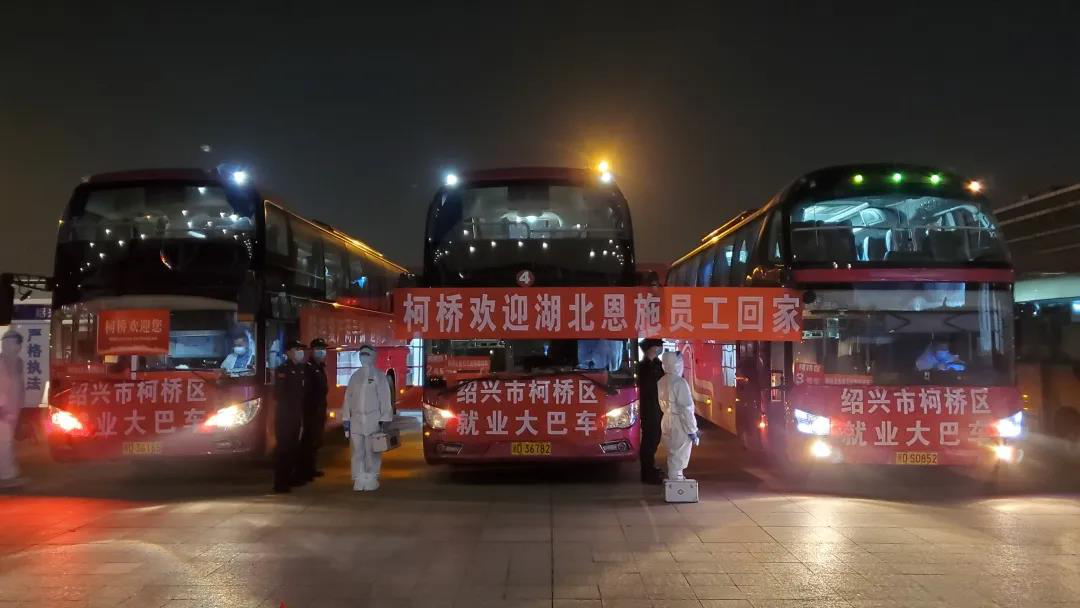 當(dāng)天上午9點(diǎn)30分,湖北省恩施土家族自治州發(fā)出了該省新冠疫情防控以來(lái)首趟D658次就業(yè)專列。下午17點(diǎn),公車(chē)公司根據(jù)區(qū)人社局要求,積極調(diào)用三輛大巴車(chē)整裝待發(fā),提前到達(dá)紹興北站做好點(diǎn)對(duì)點(diǎn)接站準(zhǔn)備工作。19點(diǎn)34分,列車(chē)載著530余名來(lái)自湖北恩施的務(wù)工人員抵達(dá)紹興北站,經(jīng)過(guò)1個(gè)小時(shí)的測(cè)量登記、確認(rèn)就坐,晚上21點(diǎn),三輛大巴載著約100名柯橋區(qū)企業(yè)員工駛?cè)肟聵騾^(qū)集中醫(yī)學(xué)觀察點(diǎn)。